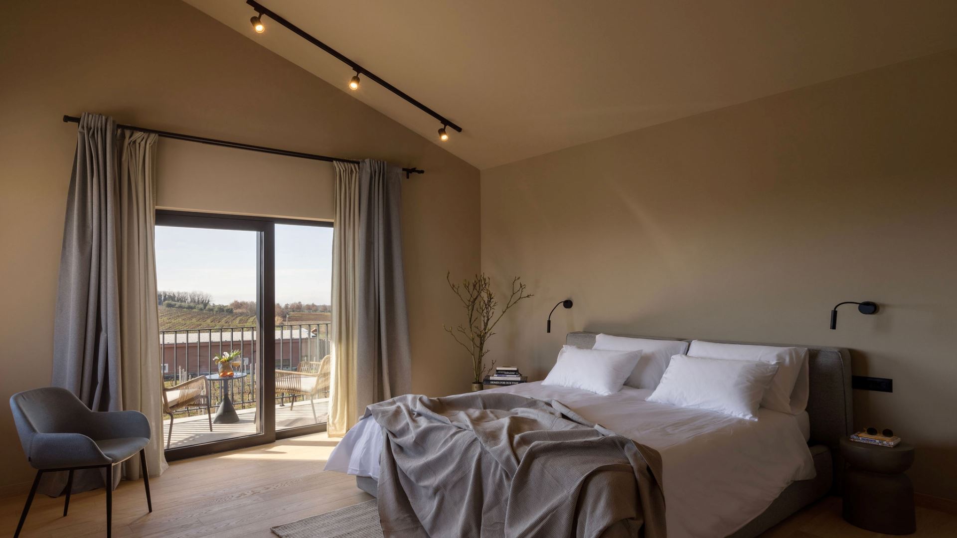Outdoor terrace with sofas connected to the living room, overlooking the vineyard and olive groves
