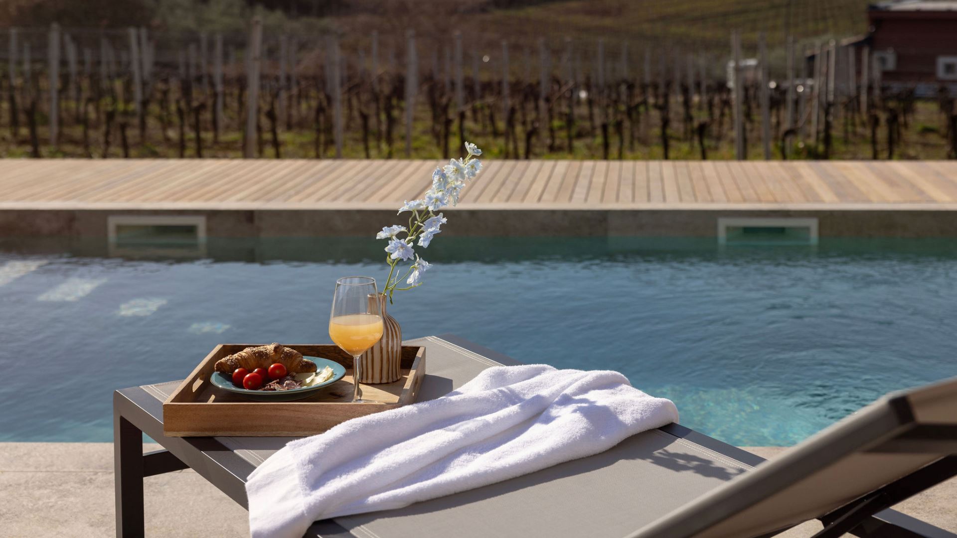 Outdoor mobile kitchen with dining table under a pergola on the terrace connected to the dining area, overlooking the olive groves and vineyards