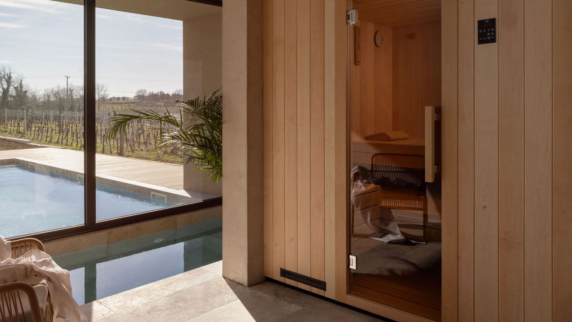 Spa relaxation area with indoor Jacuzzi, Finnish sauna, shower, and separate toilet